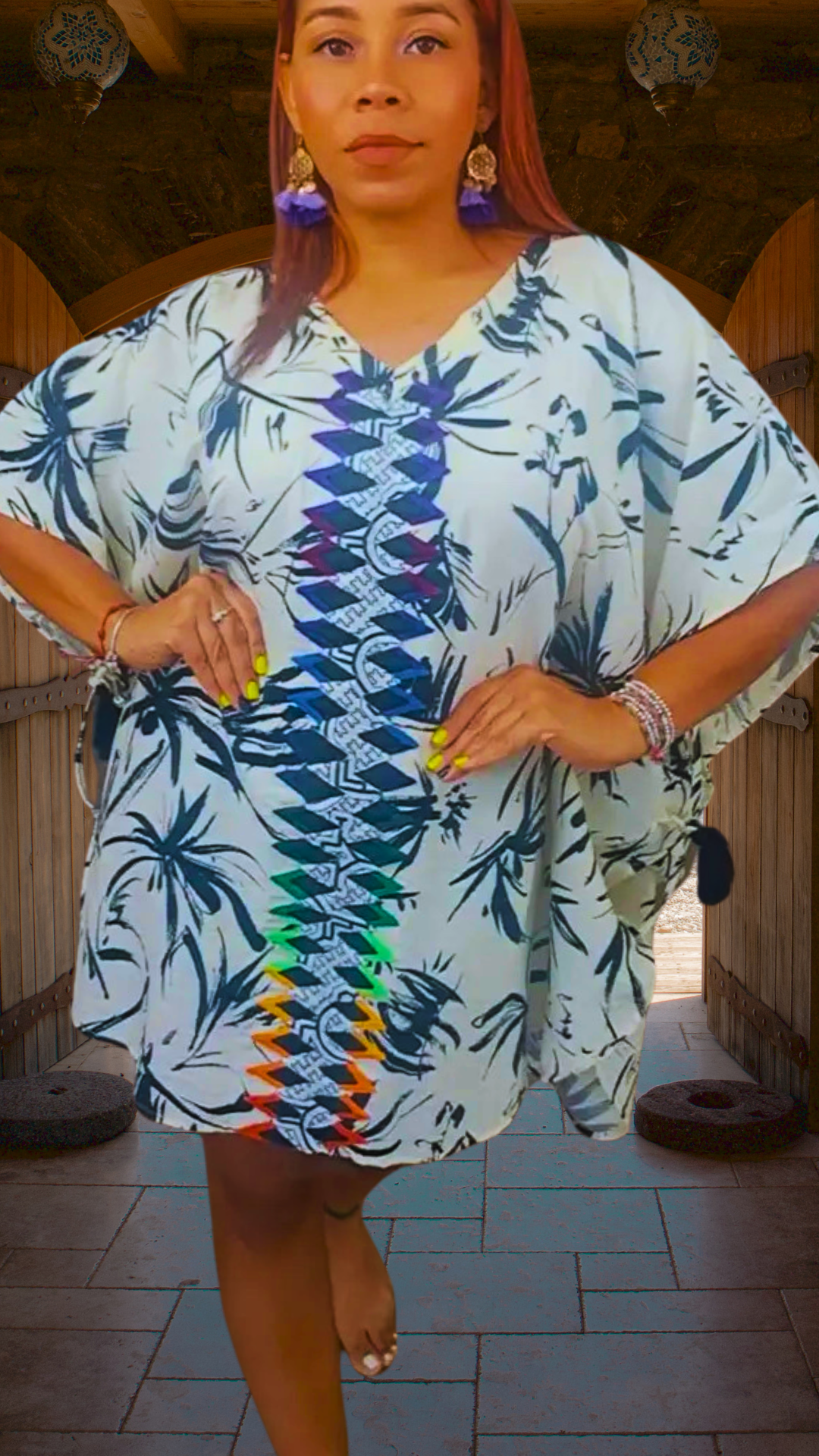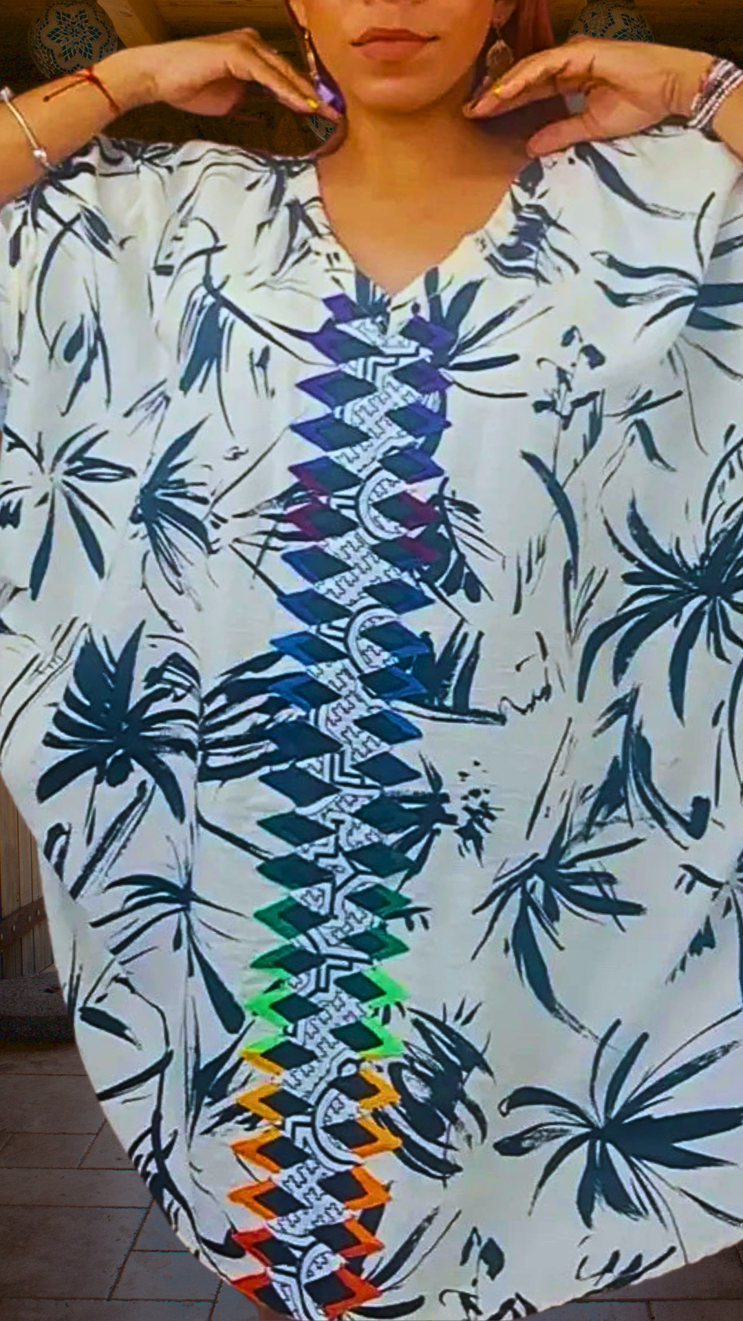 This short poncho represents a unique Panamanian collaboration between indigenous artisans and local tailors and designers at Nido. It features authentic Guna indigenous molas from Panama combined with Ngabe Bugle pintas appliqué. The kaftan has a V-neck, squared hem, adjustable ties on each side, a pocket, and open legs below the knee. It also includes handmade washable tassels in keeping with ceremonial wear.