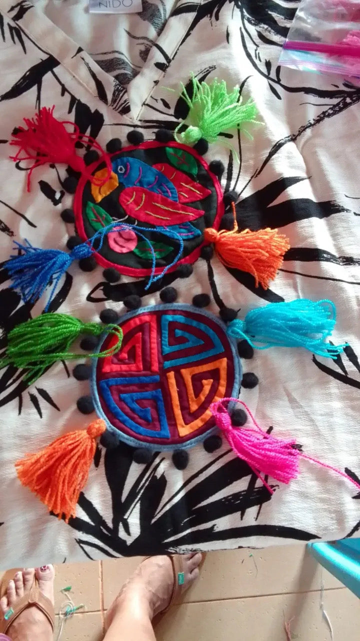 This artesanal Mola Poncho represents a unique Panamanian collaboration between indigenous artisans and local tailors and designers at Nido. It features authentic Guna indigenous molas from Panama. The Poncho has a V-neck, adjustable ties on each side. Includes washable handmade tassels.