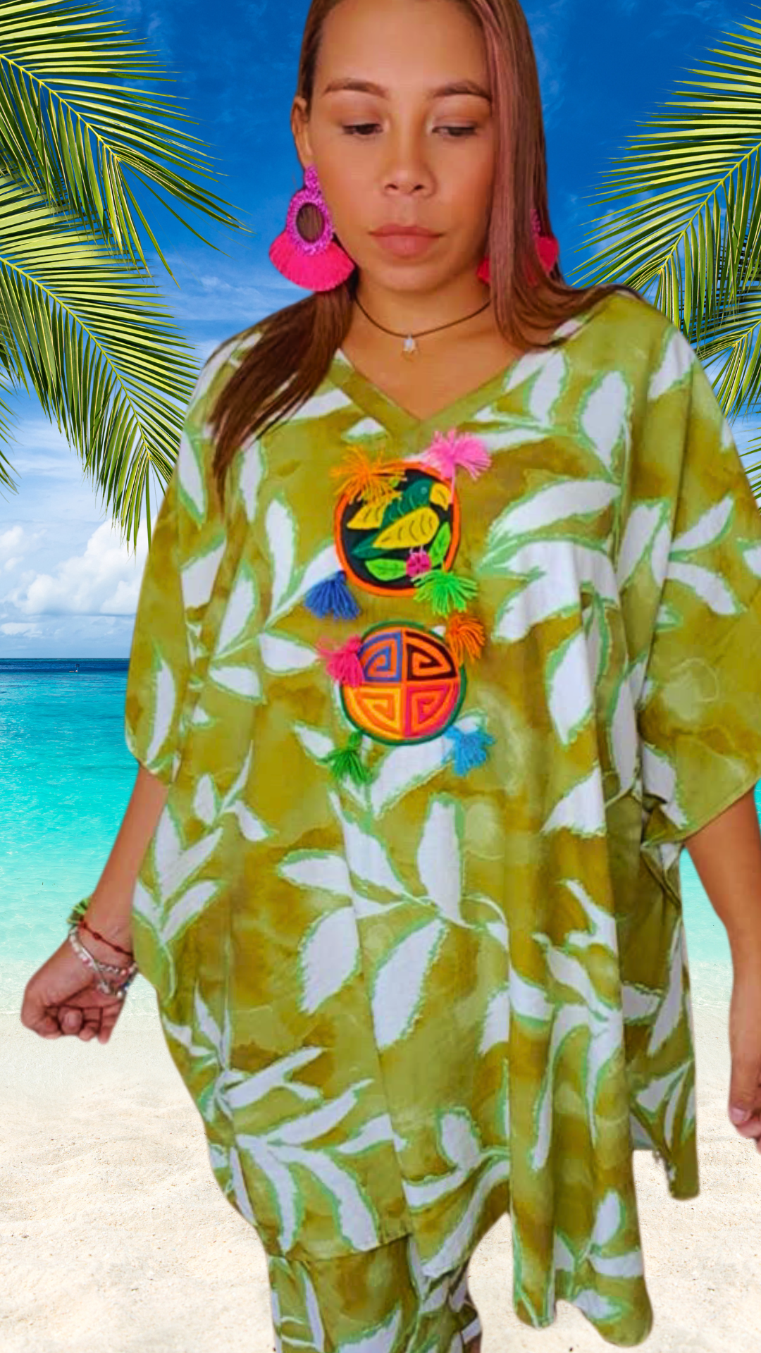 This artesanal Mola Poncho represents a unique Panamanian collaboration between indigenous artisans and local tailors and designers at Nido. It features authentic Guna indigenous molas from Panama. The Poncho has a V-neck, adjustable ties on each side. Includes washable handmade tassels.